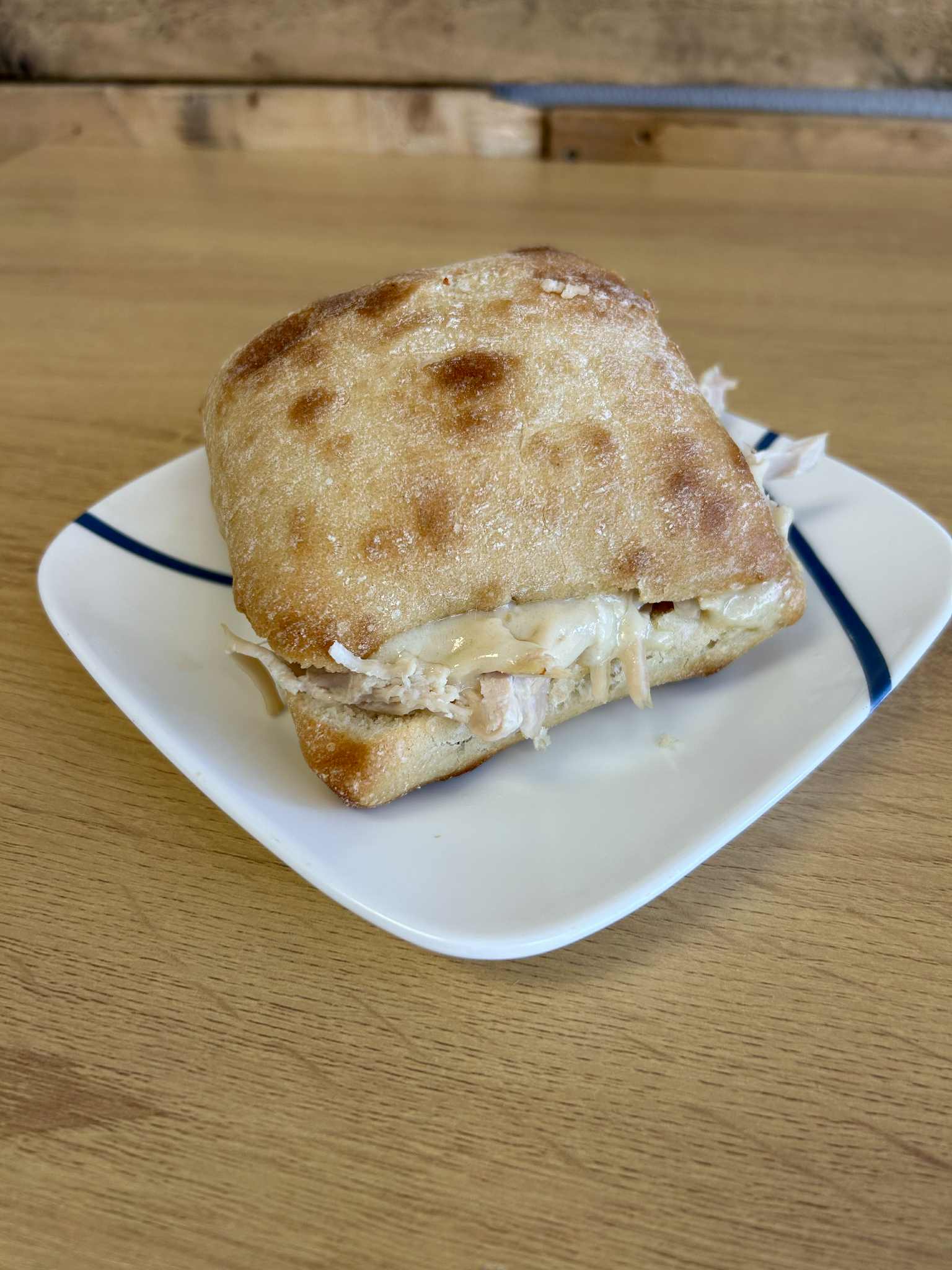 Slow cooked pulled turkey with stewed onions, swiss cheese on a ciabatta bun, served with jus for dipping