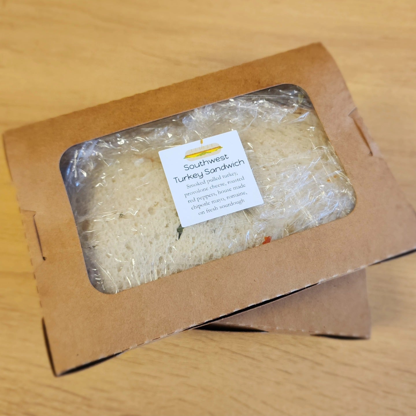 Smoked pulled turkey, provolone cheese, roasted red peppers, house made chipotle mayo, romaine, on freshly baked sourdough bread
